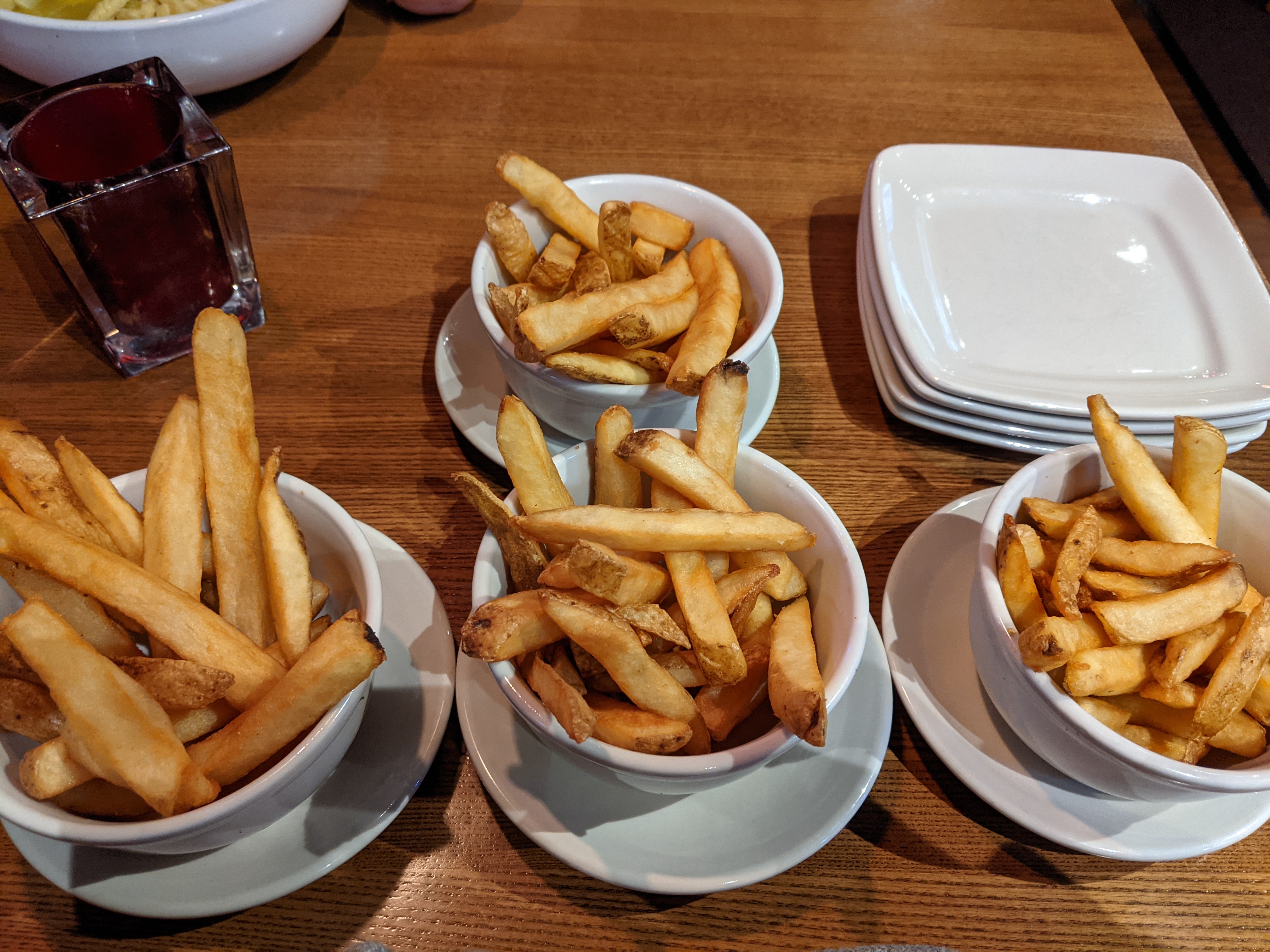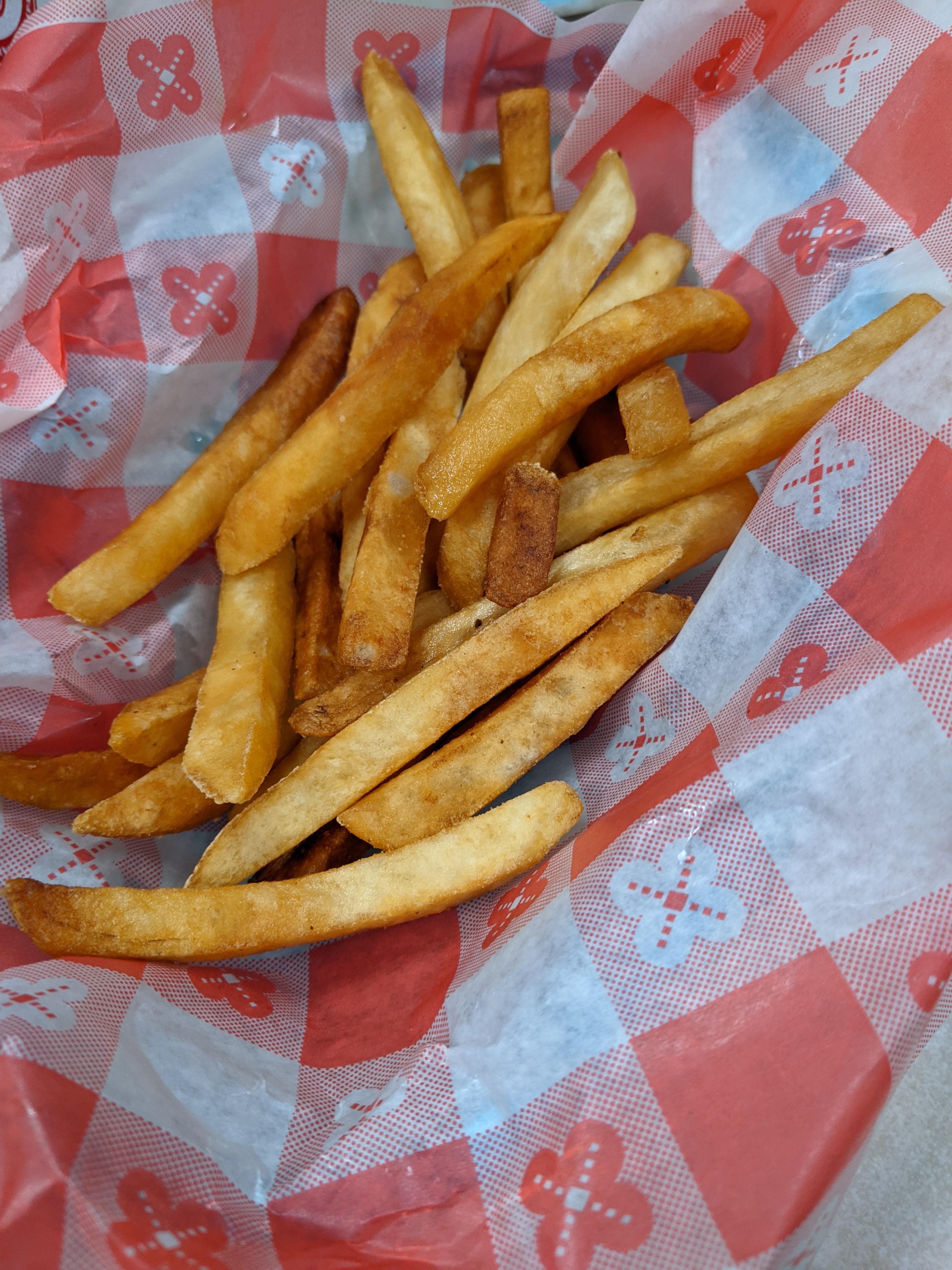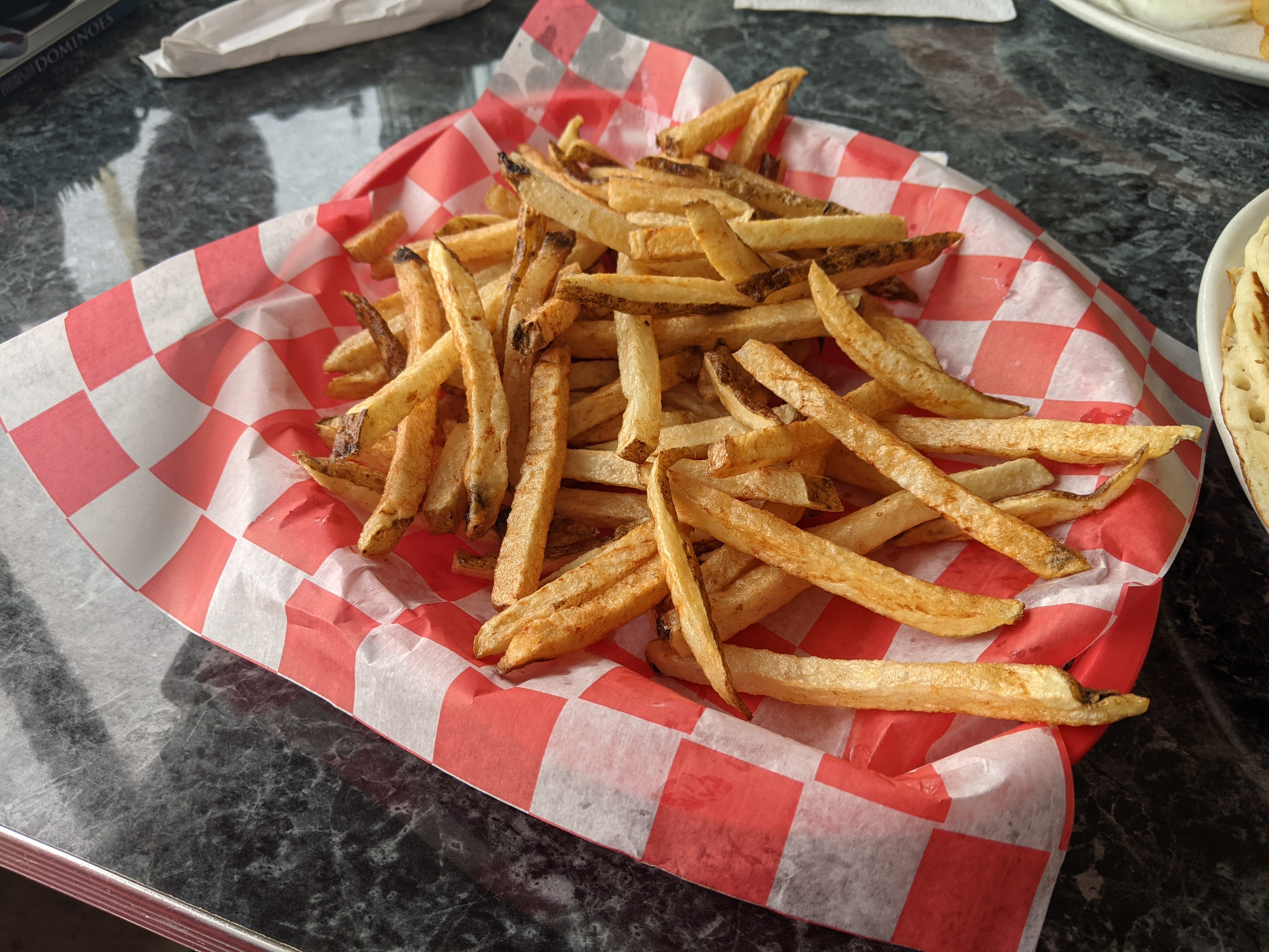 The fries here are a straight cut variety. Visually, the first thing that stands out is the color variation, this doesn’t affect the taste, and isn’t particularly indicative of the crispiness of the fry area. Fries were very warm when served, but not extremely hot. The fries were well cooked, and had the crispy exterior/fluffy interior that is often highly desired in french fries. Serving size was on the smaller side, but the price was also pretty low, so it balances out pretty well in this regard. This is another place, similar to last week, where the french fry serving size was small compared to everything else. It’s the second week in a row where I was served pancakes that could only be described as outrageously sized. This place fits the definition of greasy spoon as well as any diner I’ve been to, and the decor on the inside was impressive. I’d happily go back, it’s exactly what you’d expect from a small town diner.